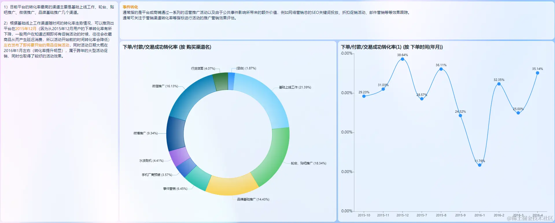 - 根据基础线上工作渠道随时间的转化率走势情况,可以推测出平台在 2015 年 12 月(因为从 2015 年 12 月用户的下单转化率有所下降,一般用户在知道近期即将有促销活动的时候,往往会收藏商品从而产生延迟消费,所以活动开始前的时间转化率会降低)左右发布了即将要开始的商品促销活动,同时活动日期在 2016 年 1 月左右(转化率提升明显),属于跨年的大型活动促销,同时也取得了较好的活动效果。