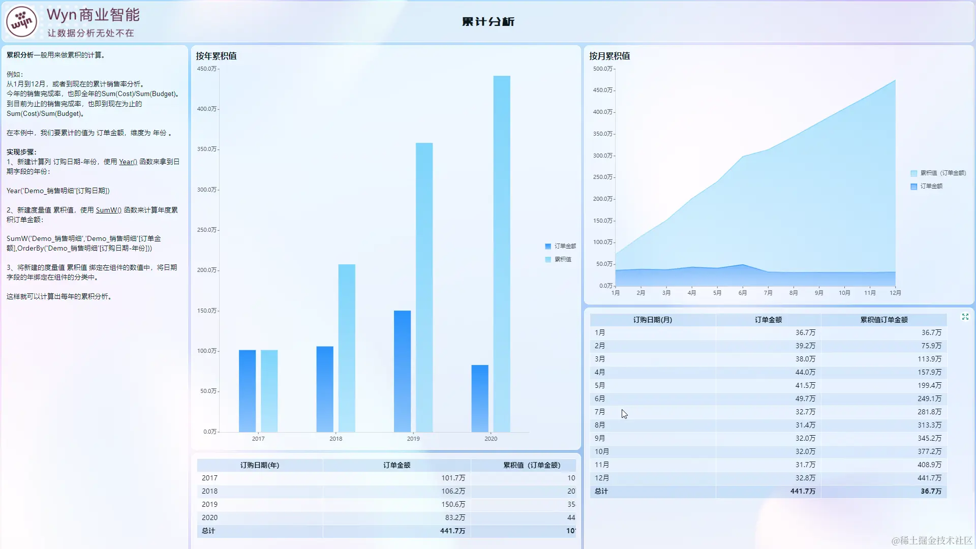 - 新建度量值 累积值,使用 SumW() 函数来计算年度累积订单金额:SumW('Demo_销售明细','Demo_销售明细'[订单金额],OrderBy('Demo_销售明细'[订购日期-年份]));