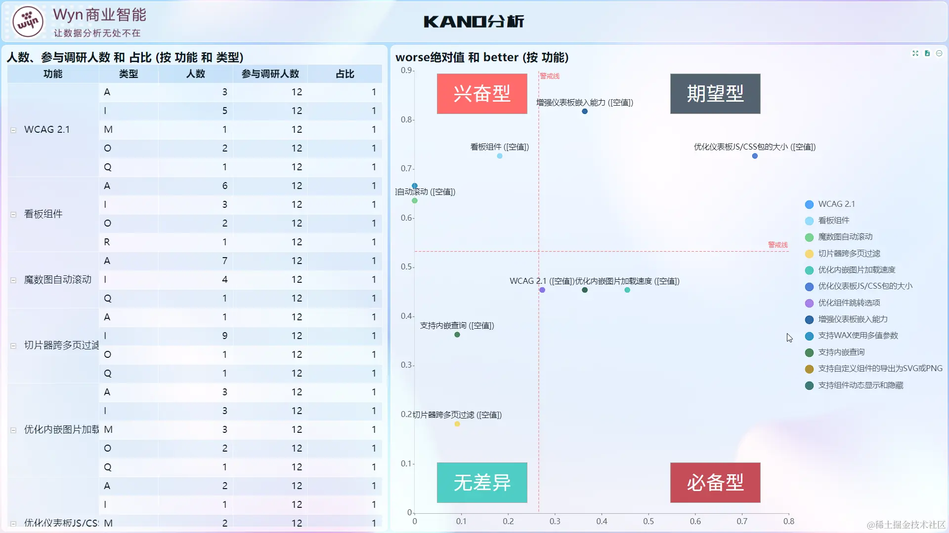 比如,通过对不同功能调研分析,将结果汇总到,兴奋型、期望型、无差异、必备型四个象限。得出必备型的功能点,需要优先满足。