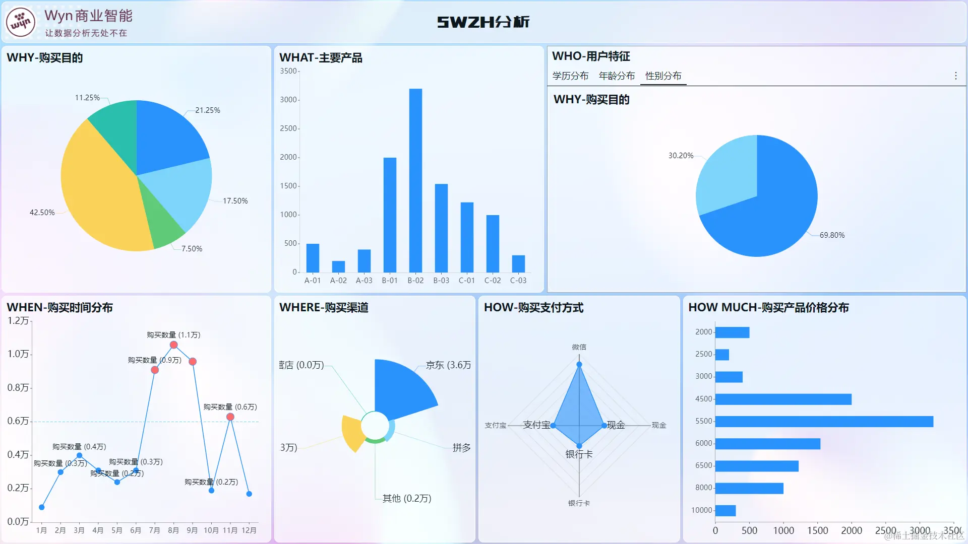 通过这 7 个问题可以辅助数据分析,发现解决问题的线索。梳理业务流程是数据分析中一个比较复杂的过程,需要我们根据具体的业务场景和业务知识来完成,然后抽象成 5W2H 分析模型中的具体每一步,完美的展示出来,比如下面的针对产品营销购买的 5W2H 数据分析: