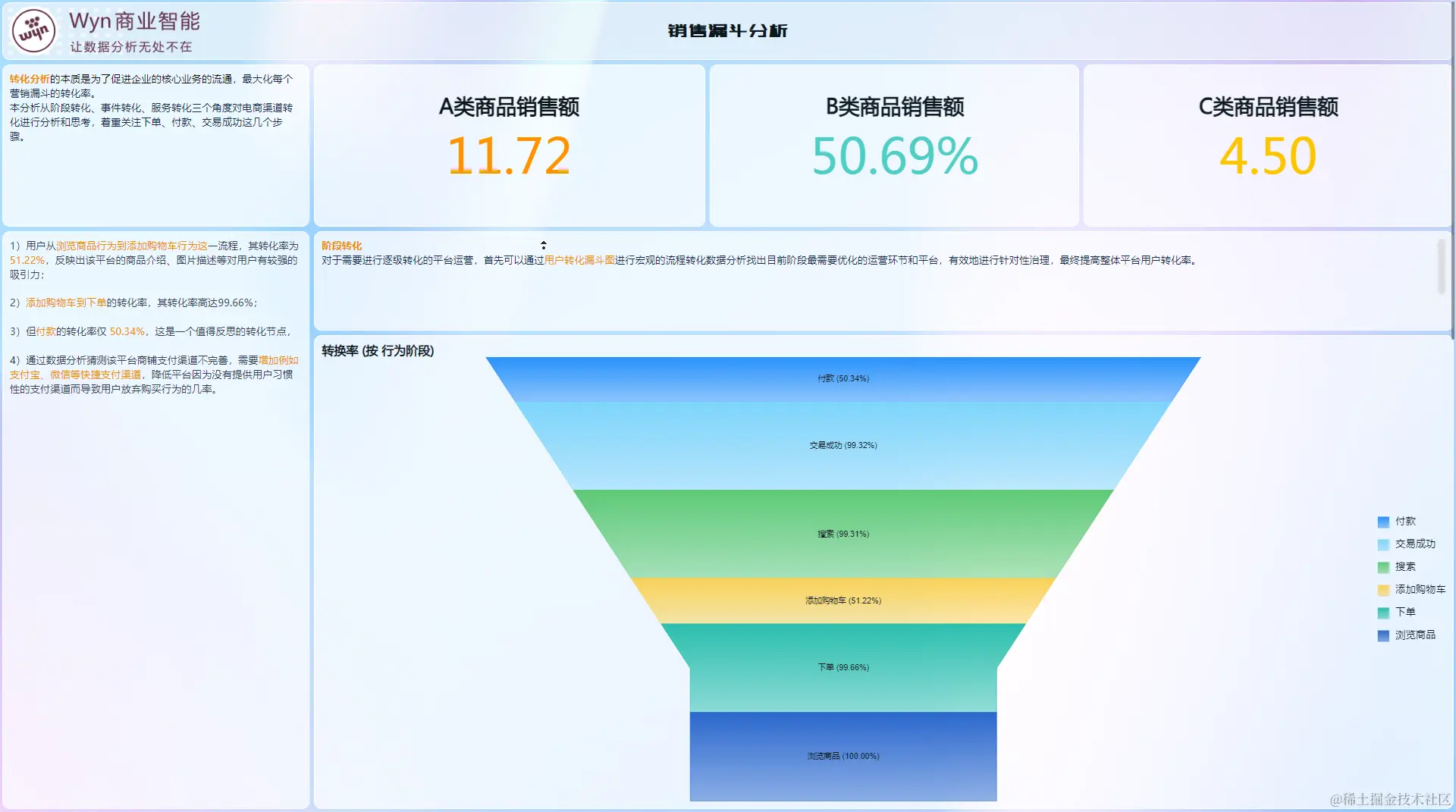 - 用户从浏览商品行为到添加购物车行为这一流程,其转化率为 51.22%,反映出该平台的商品介绍、图片描述等对用户有较强的吸引力;