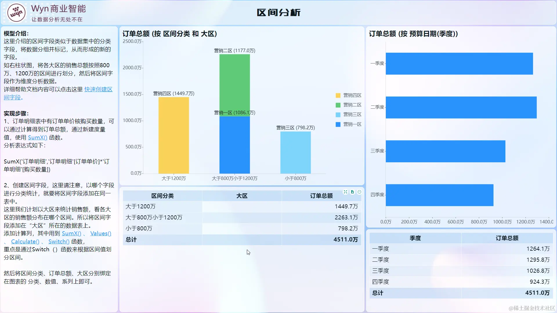 区间分析模型,通过将数据的值划分成不同的区间,通过区间分析方法,展示不同区间数据的分布规律和情况。这里介绍的区间字段类似于数据集中的分类字段,将数据分组并标记,从而形成的新的字段。如右柱状图,将各大区的销售总额按照 800 万、1200 万的区间进行划分,然后将区间字段作为维度分析数据。