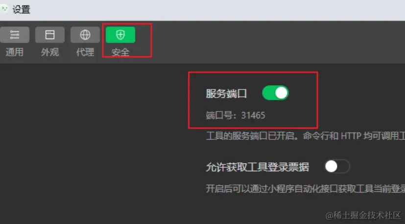 那么问题可能是出在微信开发者,我们需要进入微信开发者工具->设置->安全,然后把服务的端口号打开。