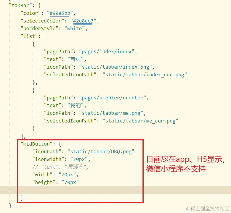 - tabBar 中的 list 是一个数组,只能配置最少2个、最多5个 tab,tab 按数组的顺序排序。
