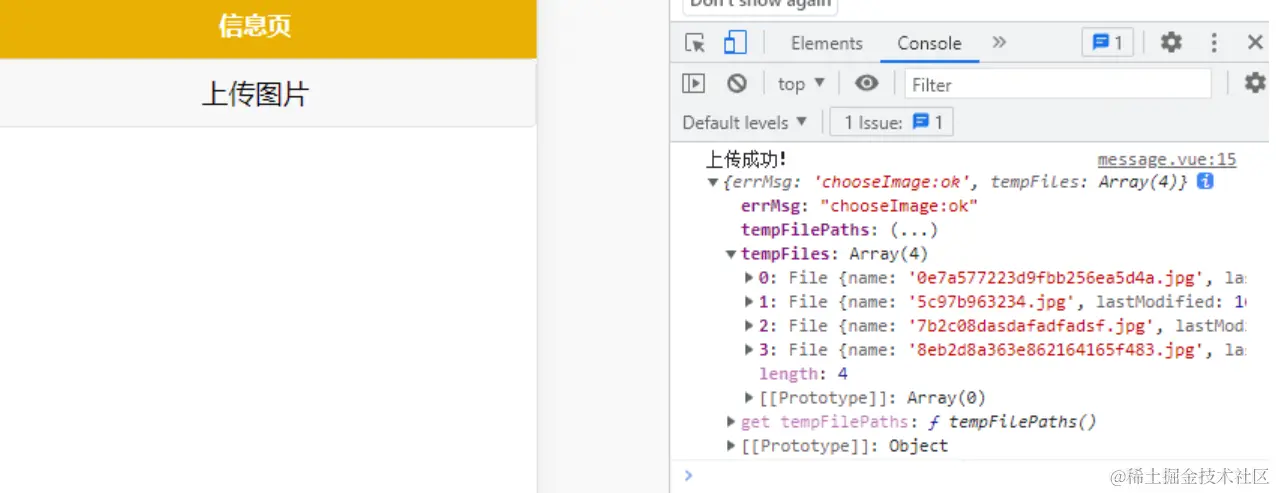 | tempFiles | Array、Array | 图片的本地文件列表,每一项是一个 File 对象 |