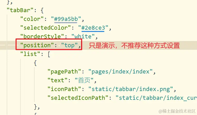 - 顶部的 tabbar 目前仅微信小程序上支持。需要用到顶部选项卡的话,不建议使用 tabbar 的顶部设置,而是自己做顶部选项卡,可参考 hello uni-app->模板->顶部选项卡。