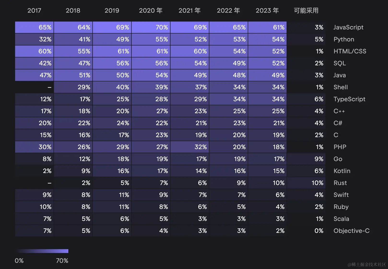 在过去三年中,JavaScript 的使用率有所下降,可能会持续下降,而 Rust 则成为唯一在今年创下受欢迎程度新纪录的编程语言。Objective-C 近年来失去了三分之二的用户,几乎没有理由继续使用。Scala、Go 和 Kotlin 的开发者拥有最高薪酬。在开发者中,只有 5%是女性,存在性别差距,而在韩国,30 岁以下女性程序员占比达 14%,可能是政府政策的结果。开发者最常使用 AI 助手的方式是通过自然语言询问问题。职业倦怠的开发者对心理健康表现出更强烈的兴趣。大多数开发者是通过大学和其他正规教育机构学习编程,而超过一半从事数据科学、机器学习或数据工程领域的开发者是自学的。46%的受访者使用云服务,同样比例的人将测试用例设计作为测试过程的一部分。41%的受访者曾为开源项目做出过贡献,而 61%的受访者实践过协作开发,其中 45%在线上进行,30%面对面进行。
