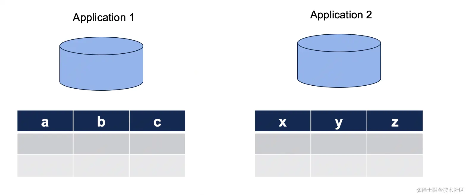 不同系统应用,使用不同的数据schema,数据完全独立,一般界限清晰的不同系统可以采用这种方式。