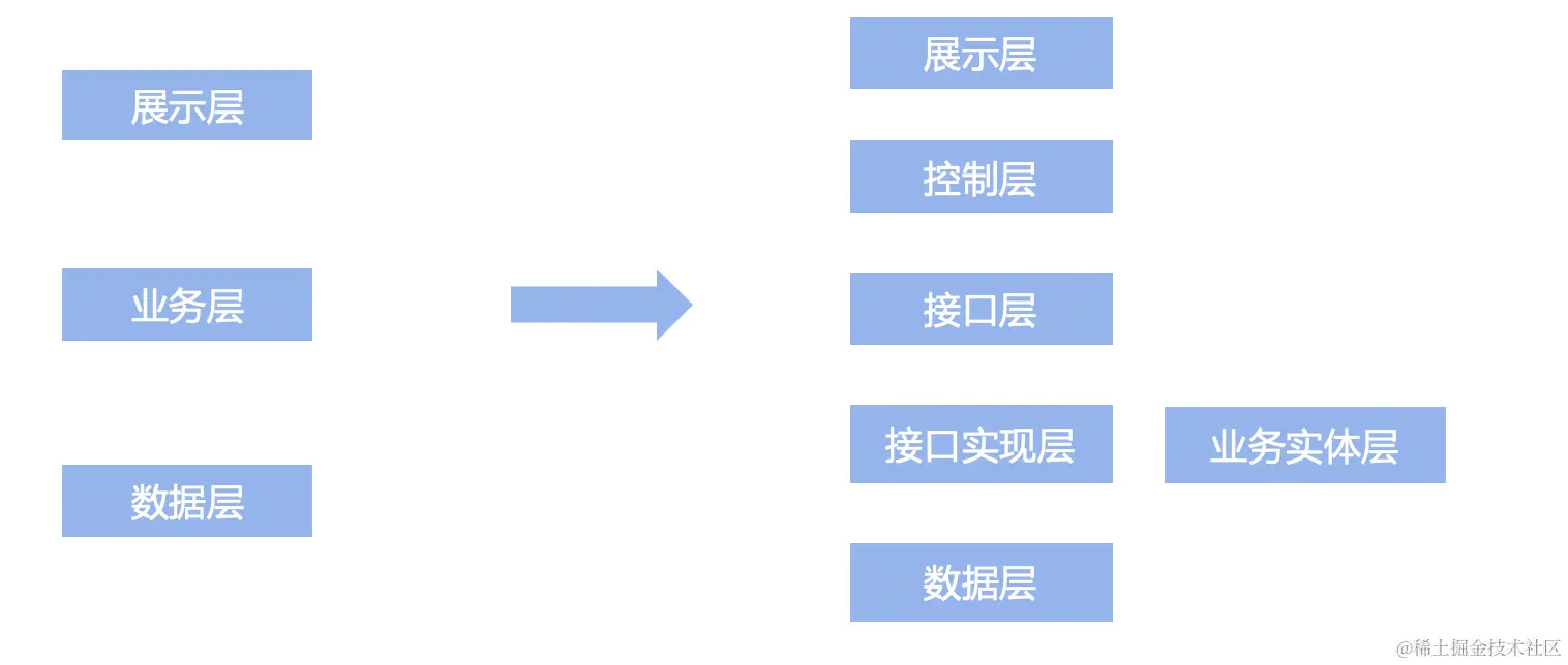 根据系统设计的需要,可以将系统的分层进行细化,例如展示层 -> 业务层 -> 数据层 可以细化为:展示层 -> 控制层 -> 接口层 -> 接口实现层 -> 数据层。