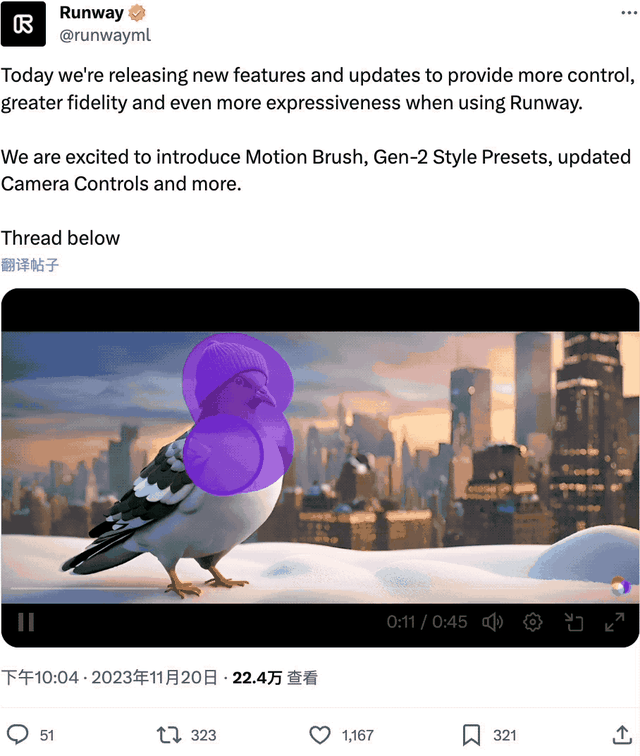 参考链接: [1]research.runwayml.com/more-contro… [2]twitter.com/runwayml/st…