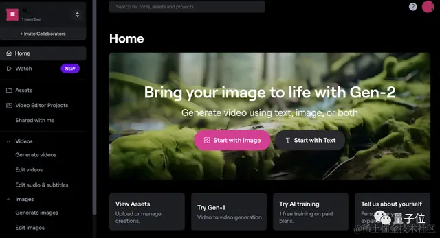 首先,进入Runwayml主页,点击粉色的“Start with image”按钮: