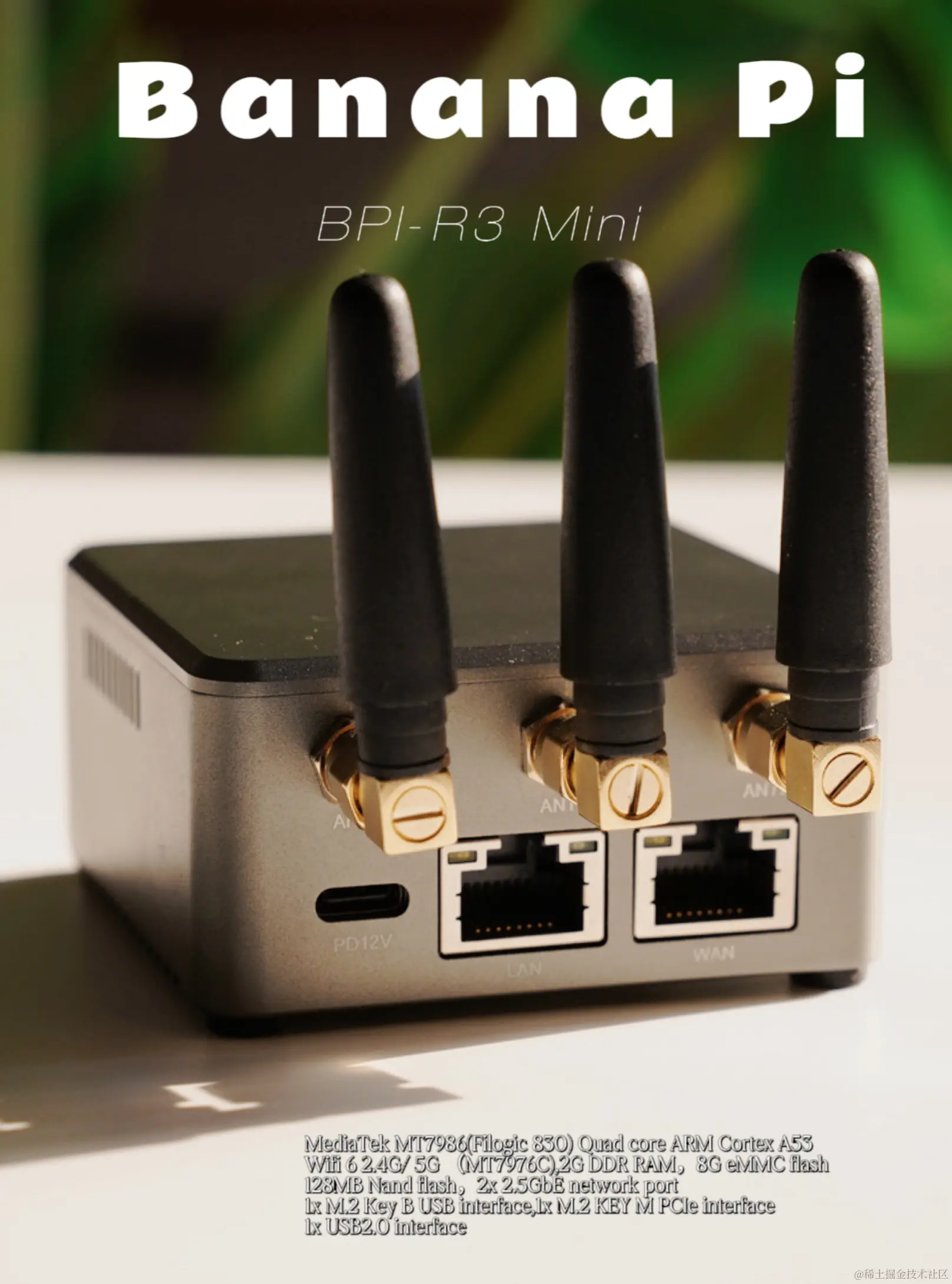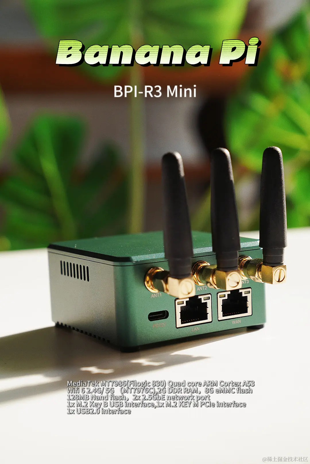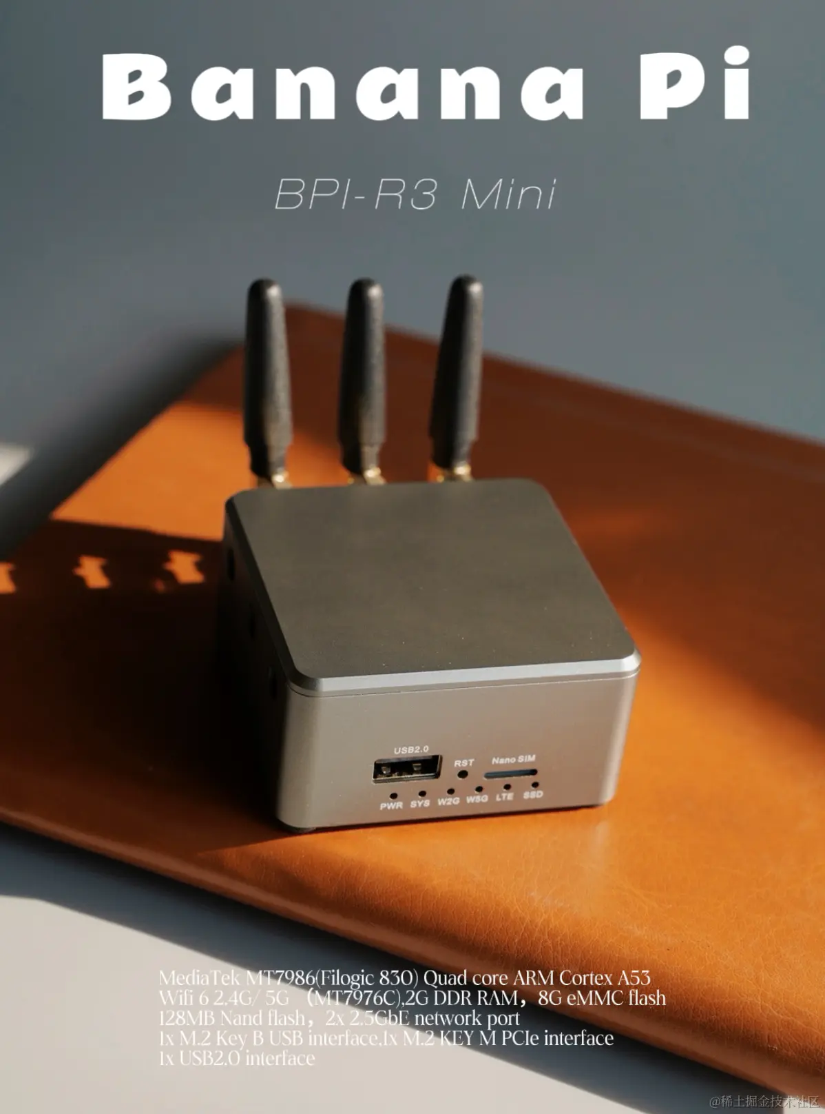 香蕉派BPI-R3 Mini路由器板开发板采用联发科MT7986A(Filogic 830)四核ARM A53芯片设计,板载2G DDR 内存,8G eMMC和128MB SPI NAND存储,是一款非常高性能的开源路由器开发板,支持Wi-Fi6 2.4G/5G(MT7976C),支持2个2.5GbE网口,并支持NVME SSD(2230)以及4G LTE、5G网络扩展。