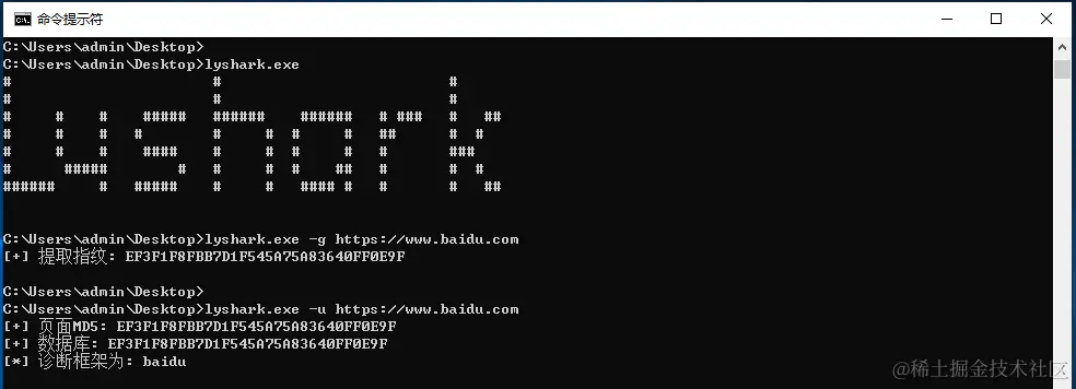 通过参数-u用于识别一个网站是什么框架,使用-g则是获取当前页面指纹特征,如下图;
