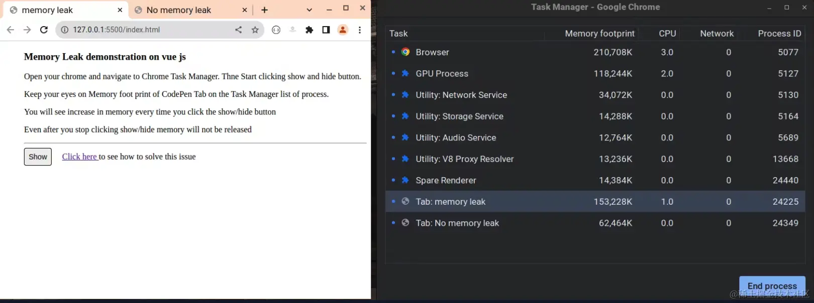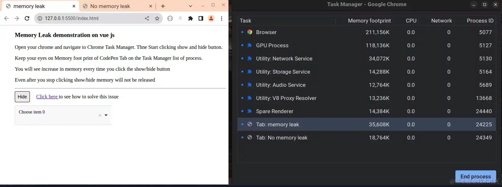 在Chrome浏览器中打开项目,到谷歌任务管理器,观察这个组件的内存使用情况,当你点击