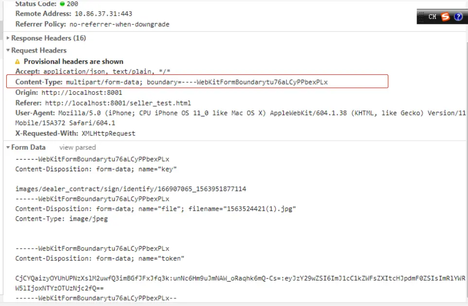 使用表单上传文件时,multipart/form-data不会对参数编码,请求体被分割成多部分,让服务器知道如何拆分它接受的参数。每部分使用 --boundary分割,相当于&,boundary的值是----Web**PLx。