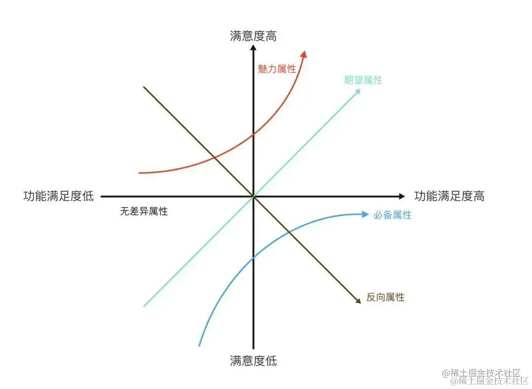 必备属性:这一类的产品功能特性是,没有会很糟糕,有了勉强可以及格,但远未达到满意的地步。比如家用冰箱,制冷就属于它的必备属性,即使你把制冷温度能够降到-100度,我也没觉得他让我多么满意,这就是必备属性。必备属性就如同他的名字一样,必须具备但是适可而止,这不是产品功能核心竞争力。