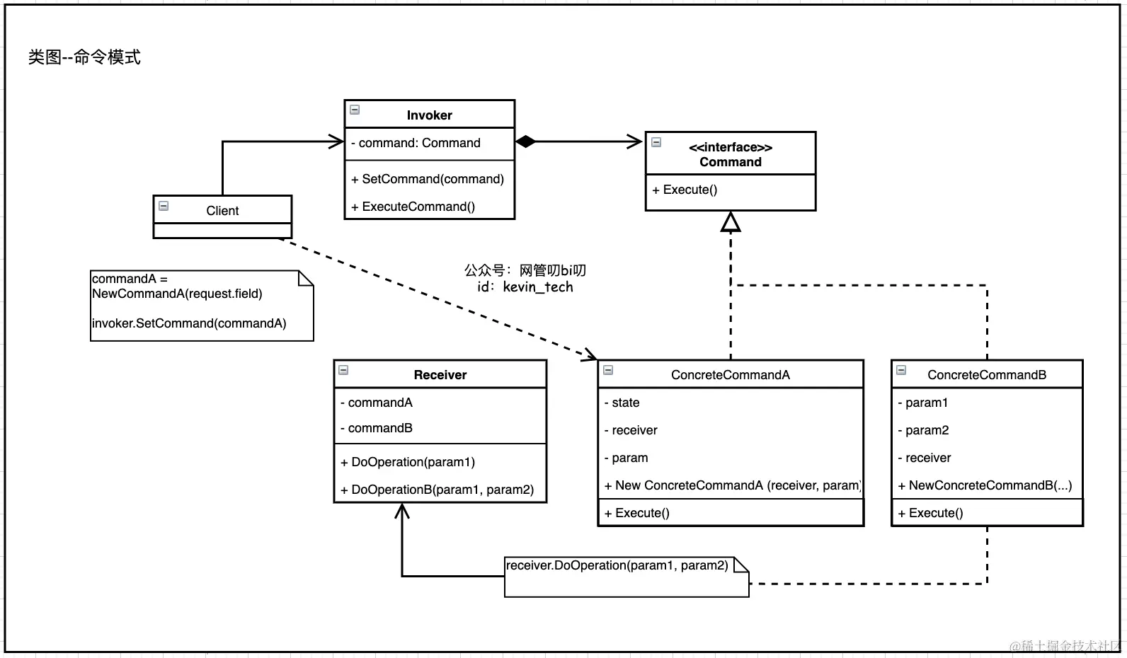 - Command:命令对象,组装了一个Receiver成员,并绑定实现了Receiver的一个特定行为的调用