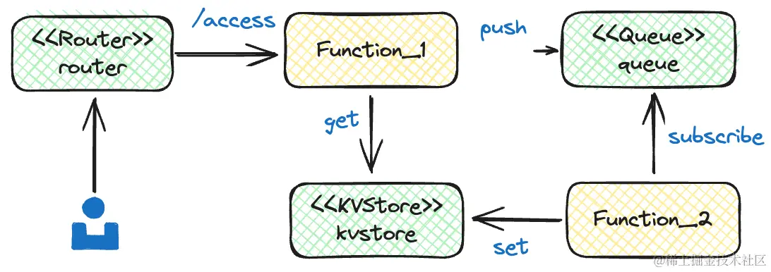 /accessHTTP 请求,请求中将本次的访问时间发布到消息队列 queue,然后从 KV 数据库 kvstore 中获取上一次访问时间,并返回。 - 一个消息队列 queue,有一个订阅者,将消息队列中的消息保存到 KV 数据库 kvstore 中。