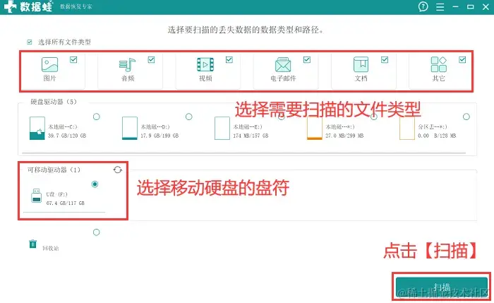 步骤2:对需要进行扫描的文件类型进行选择,完成后勾选上移动硬盘所在的盘符,点击 【扫描】;