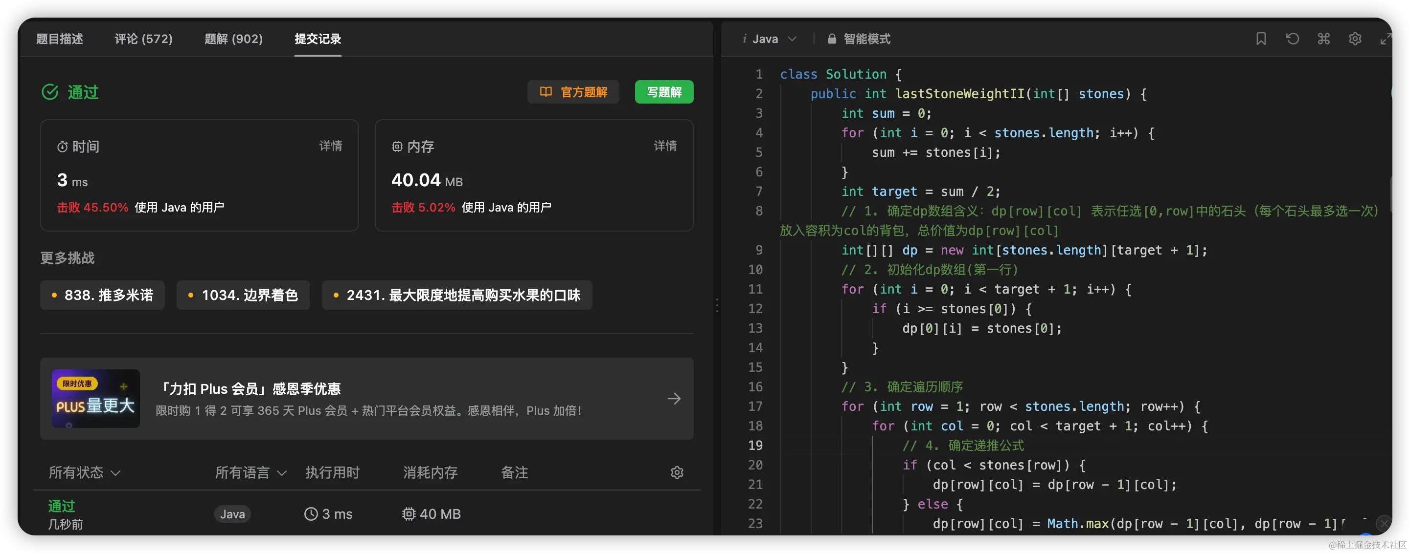 - 空间复杂度:O(n*target),其中n是数组长度,target 是整个数组的元素和的一半