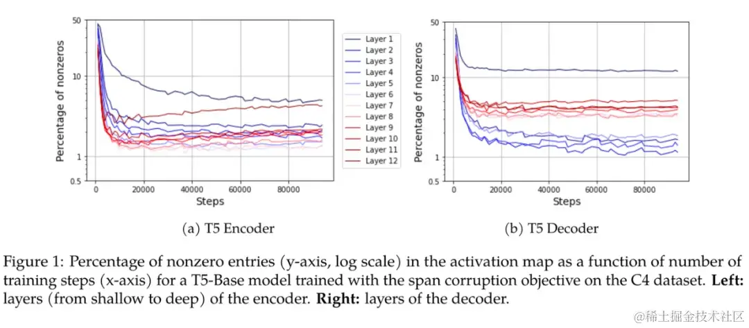 该工作用大量实验揭示了非常直接但有趣的一个现象:Transformer 架构的激活层非常的稀疏。在 T5-Base 中,只有 3% 的神经元被激活了(ReLU 输出值非 0)。并且增大模型会使其更加稀疏,以及和数据似乎无关。无论使用视觉还是语言,甚至是随机数据,以及不重复的数据,都有该现象出现。作者简单的讨论了这种现象可能和优化动力学相关。笔者认为这个现象可能会给 Transformer 的优化器设计一些启示。