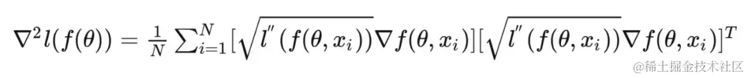 通过链式法则即可证明。这里的第一项被称作 Gauss-Newton 阵,它衡量了由于网络特征 的变动贡献的 Hessian 阵值。第二项则是由于输入值的变动贡献的 Hessian 阵值。由于第二项通常很小,所以我们可以近似认为黑塞阵由 Gauss-Newton 阵决定。通过变形,我们可以得到 Gauss-Newton 阵的另一种形式,衡量了样本的带权二阶矩。可见 Gauss-Newton 阵与 Fisher information 有着密切的联系。