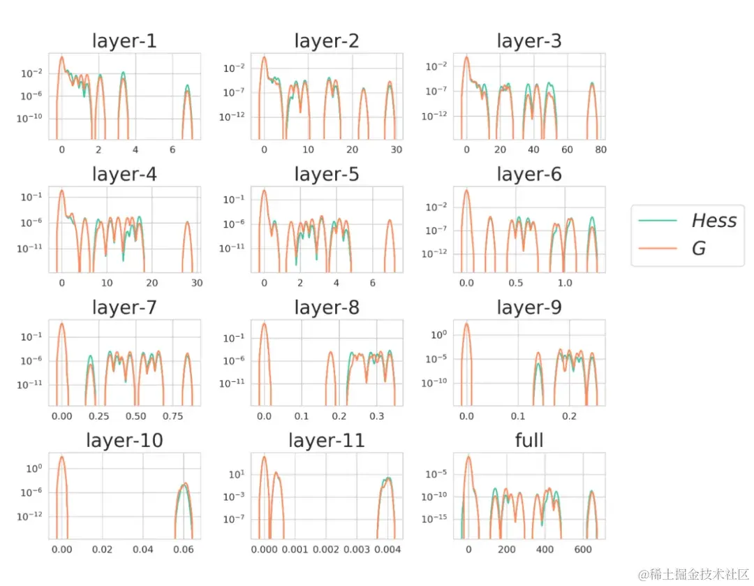 [SEG+18,SKV20] 都指出了这一点。实验如图所示。Sophia 等二阶优化器正是利用了这点进行对角黑塞阵的计算。[LGZ+19,P19] 则验证了梯度的二阶矩的大特征值与 Hessian 阵的大特征值近似。