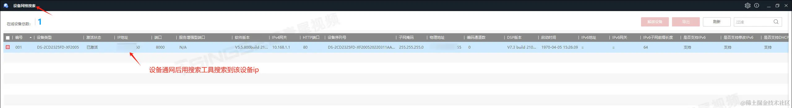 1)设备通网后,利用搜索工具搜索到该设备的IP;