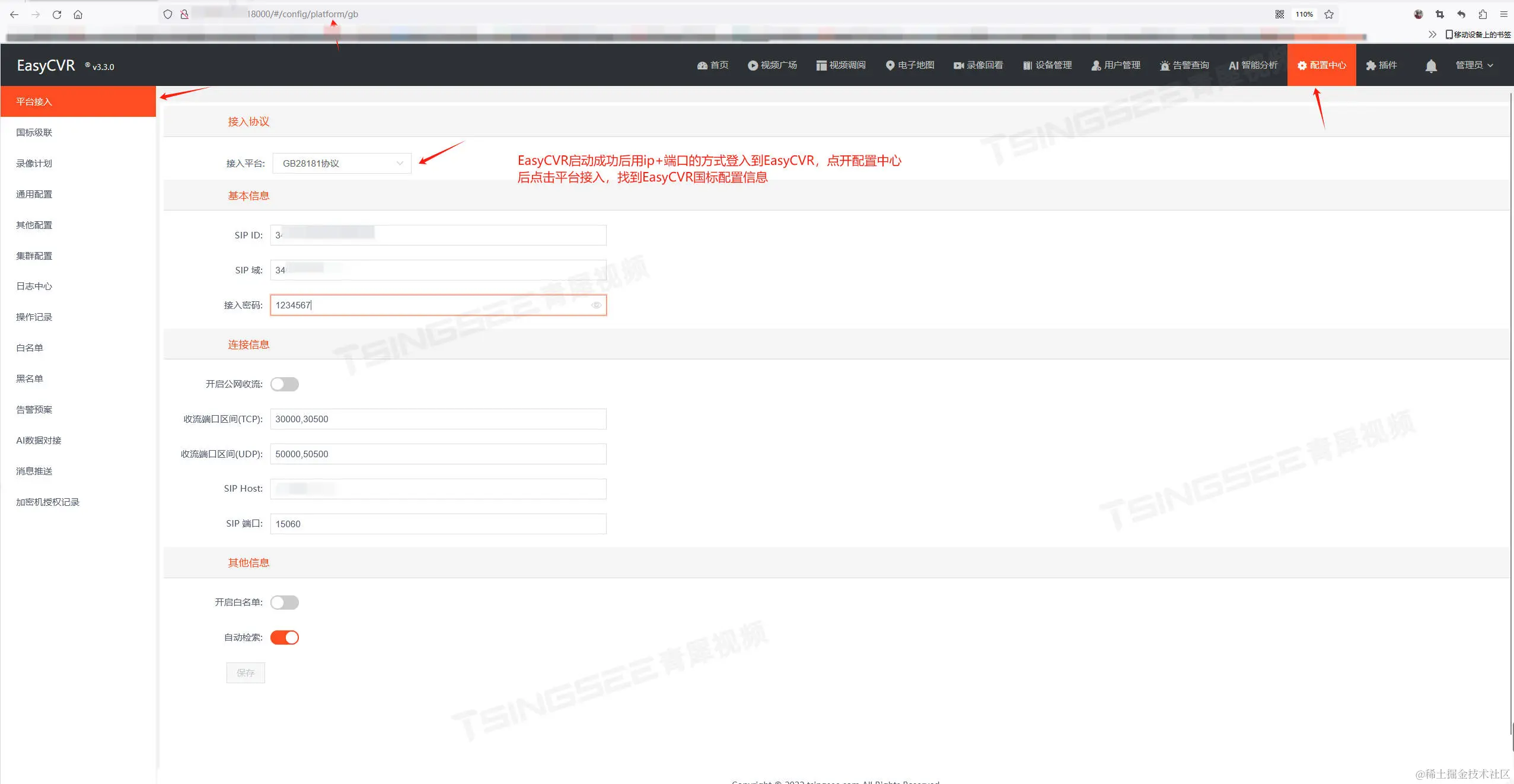 5)EasyCVR启动成功后,用ip+端口登入到平台,在【配置中心】-【平台接入】中,配置国标信息,如下所示: