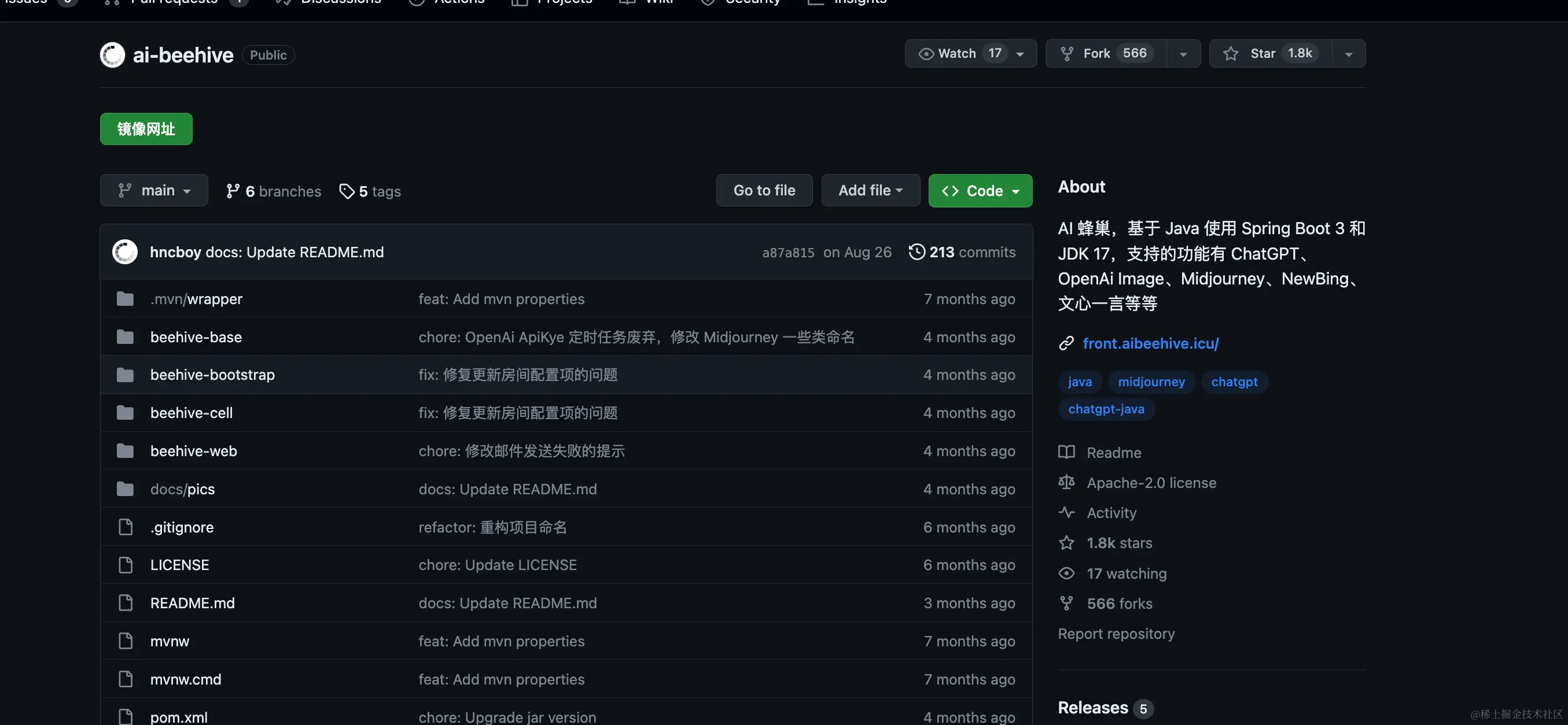 1.8k个star,可见其欢迎程度,作者关注这个项目的时候,名称还为chatgpt-web-java,现在已经更名为aibeehive
