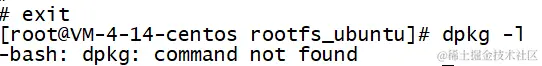 使用 exit 退出当前sh,再执行 dpkg 指令发现找不到,因为当前是 centos 系统,需要使用 rpm -qa 方式查看: