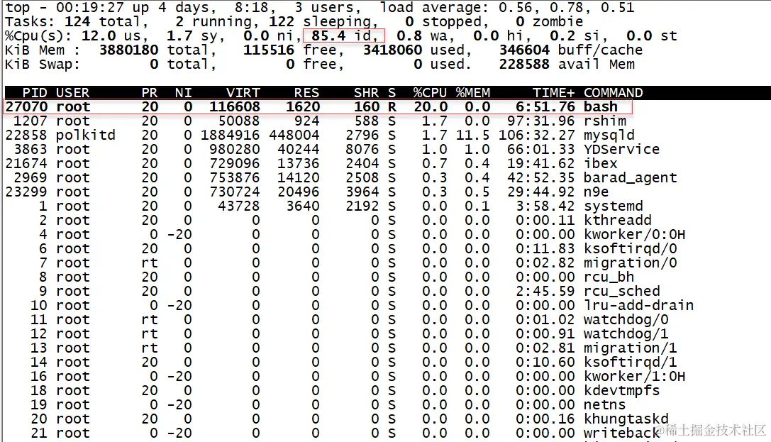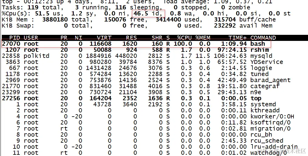 27070号进程的进程CPU使用率100%,即消耗了1核CPU资源,我这里主机是2核的,从idle一栏看出当前系统CPU使用率在53%左右。