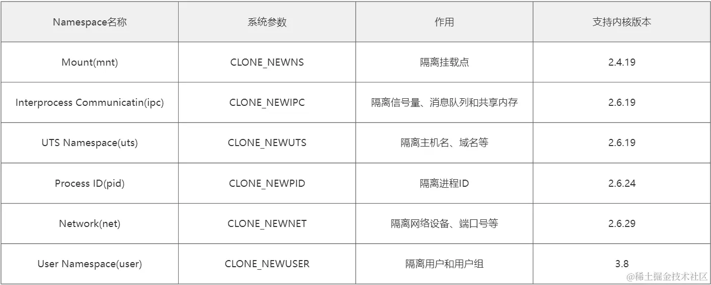 Docker 就是利用作系统的隔离技术-「NameSpace」, 来实现在同一个操作系统中,不同容器之间的资源独立运行。 Linux Namespace 是 Linux 系统内核提供的一种资源隔离机制,可实现系统资源隔离的列表如下: