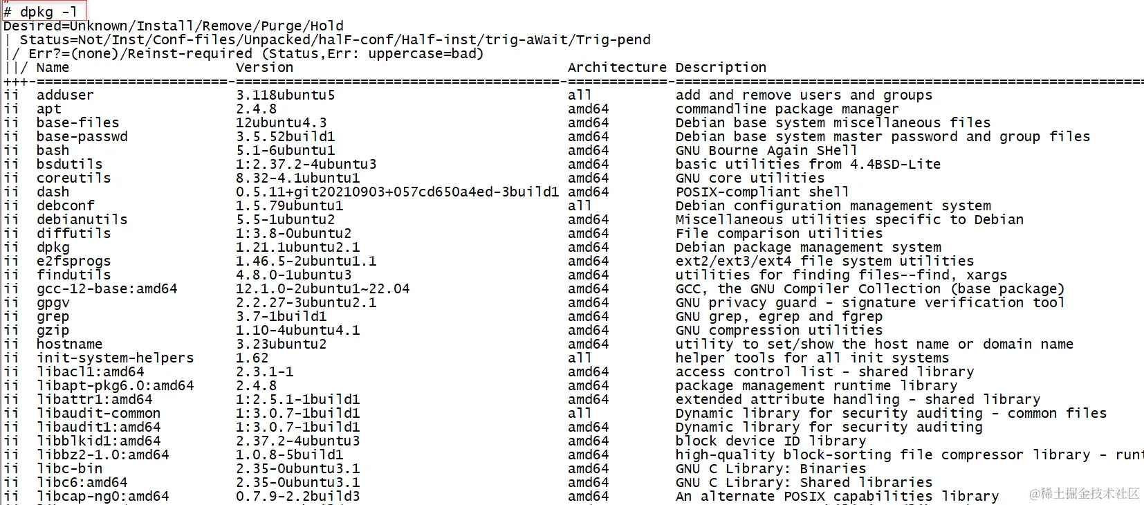 使用 ubuntu 系统中用于查看当前当前系统已安装软件dpkg -l的指令,发现也可以使用: