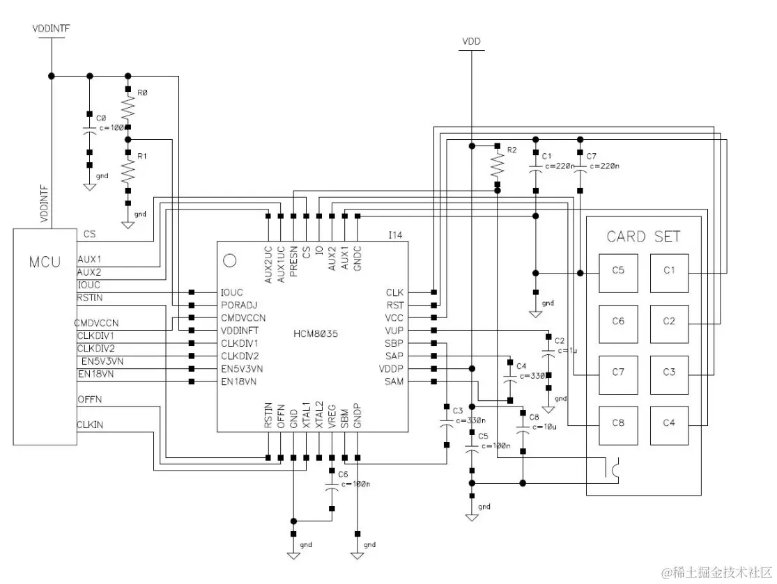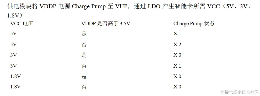 电源部分包含 DCDC 电压转换器用于给智能卡提供电源 VCC(5、3、1.8)