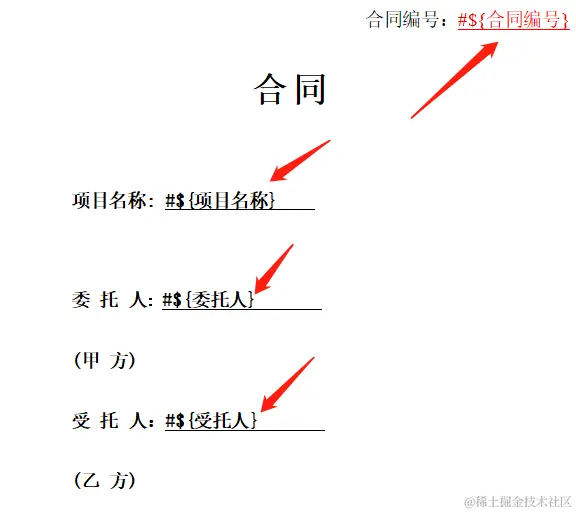 合同模板的设置如下截图所示,届时Excel表对应列的合同要素信息会填充到合同模板的相应位置,生成对应的合同文件。