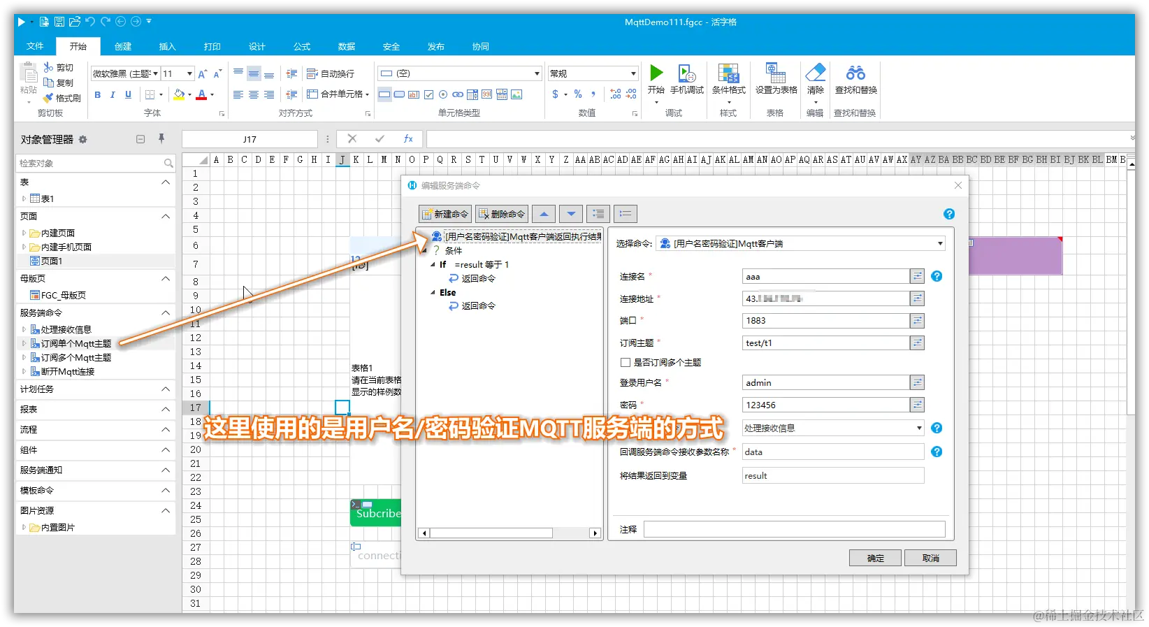 在活字格中使用《MQTT客户端》插件配置对应的服务器地址及其订阅主题,并回调服务端命令为”处理接收信息“: