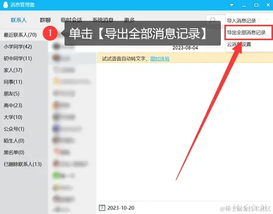 步骤2:打开【消息管理器】后,点击页面右上方的【倒三角】按钮,然后单击【导出全部消息记录】。最后在弹出的窗口中,选择保存路径,点击【保存】即可完成备份。