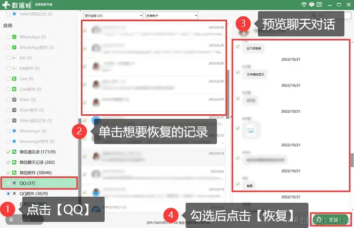 数据蛙苹果恢复专家是一款专业的数据恢复软件,可以扫描您的iPhone并有机会找回被删除的QQ聊天记录。相较于前两种方法,这种方法更加专业、安全。同时,该软件还具备强大的数据恢复功能,可以恢复照片、视频、短信、聊天记录等17种类型的数据。