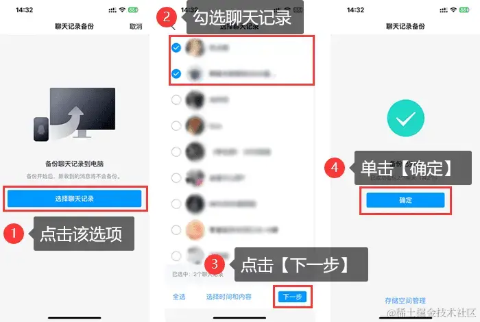 步骤4:返回手机,在列表中勾选想要备份的聊天记录,然后点击右下角的【下一步】即可完成备份。