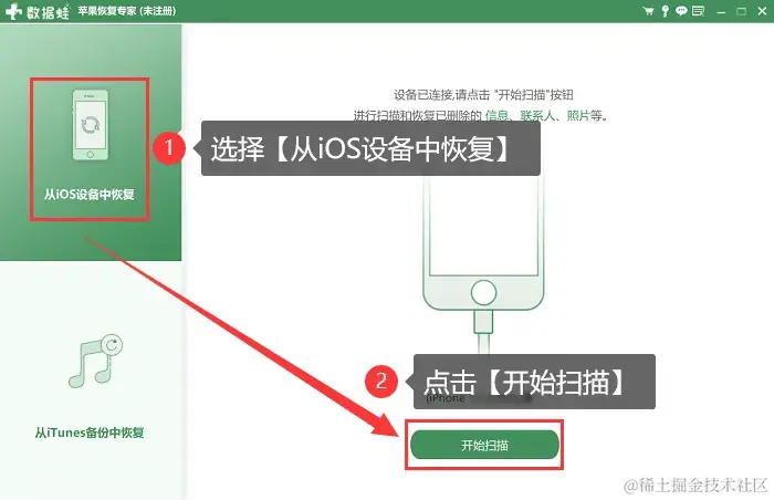 步骤2:选择首页左上方的【从iOS设备中恢复】模式,然后点击【开始扫描】选项,软件即可开始扫描手机上的数据。