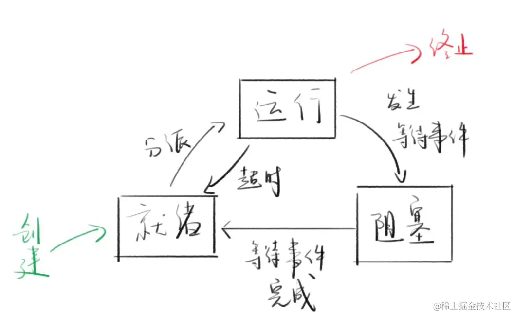 - 了解阻塞的概念之后,进程的状态就会多一个阻塞态,非运行变成就绪和阻塞两种