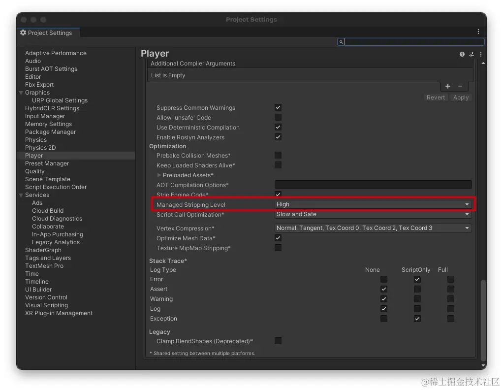 开启Strip engine Code。并且Managed Stripping Level设置成High,但是网上说设置成High可能会造成闪退等问题。