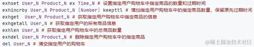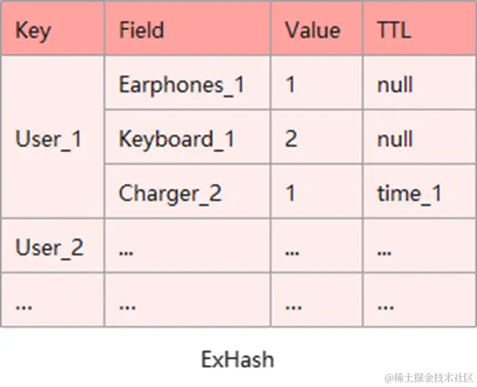 根据如图所示的exHash类型来实现购物车的管理,同Hash类型一样,用户ID作为key,商品ID作为field,value为购物车中对应商品的数量。其中对于部分限时特购的商品,由于exHash类型可以为Field设置过期时间,其过期时间可通过hset命令直接设置。