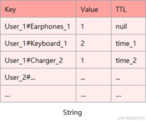 如图所示基于String可以轻松地实现各个用户的购物车功能,该方案需要将用户ID与商品ID进行拼接作为key,例如User_1#Earphones_1,key对应的value为购物车中用户准备购买的数量,其中可能有部分商品为限时特购,所以有过期时间,为key对应的过期时间。