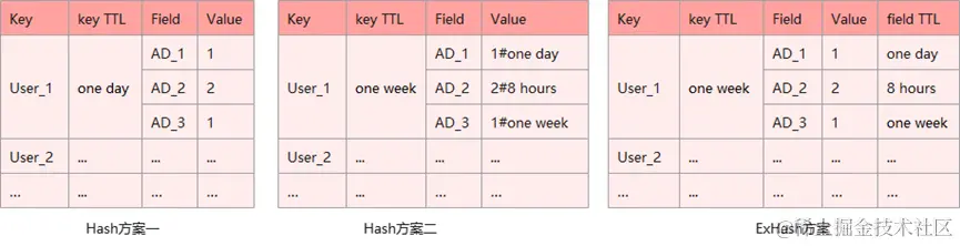 - 为了做到对每个广告都配置指定时间段内的灵活频控,如中间图所示可以通过将时间戳拼接在value里的方式用Hash类型来实现,但这种方案无疑是增加了业务侧开发的工作量。