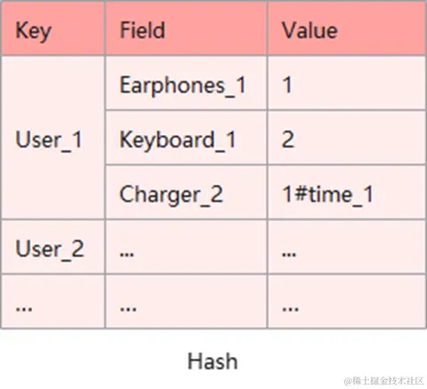 可以根据如图所示的Hash类型来实现购物车的管理,用户ID作为key,商品ID作为field,value为购物车中对应商品的数量。其中对于部分限时特购的商品,其过期时间通过拼接的方式放到field对应的value里。
