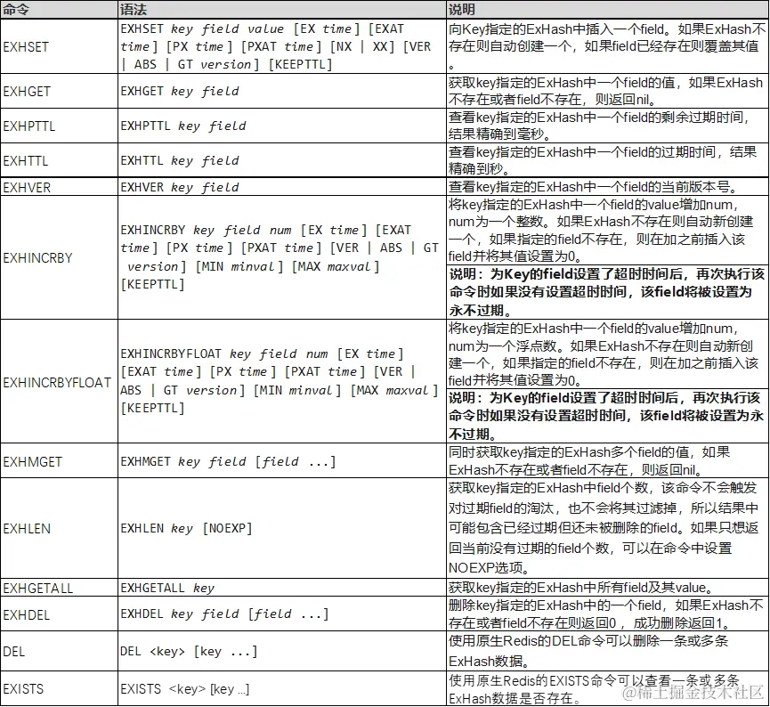 该方案相对于Hash类型的优化主要体现在可以直接为各field设置过期时间,使业务侧使用起来简单又高效。可以看到exHash类型相关的命令和Hash类型是类似的,使用起来学习成本很低,业务侧改造成本相对也比较低。