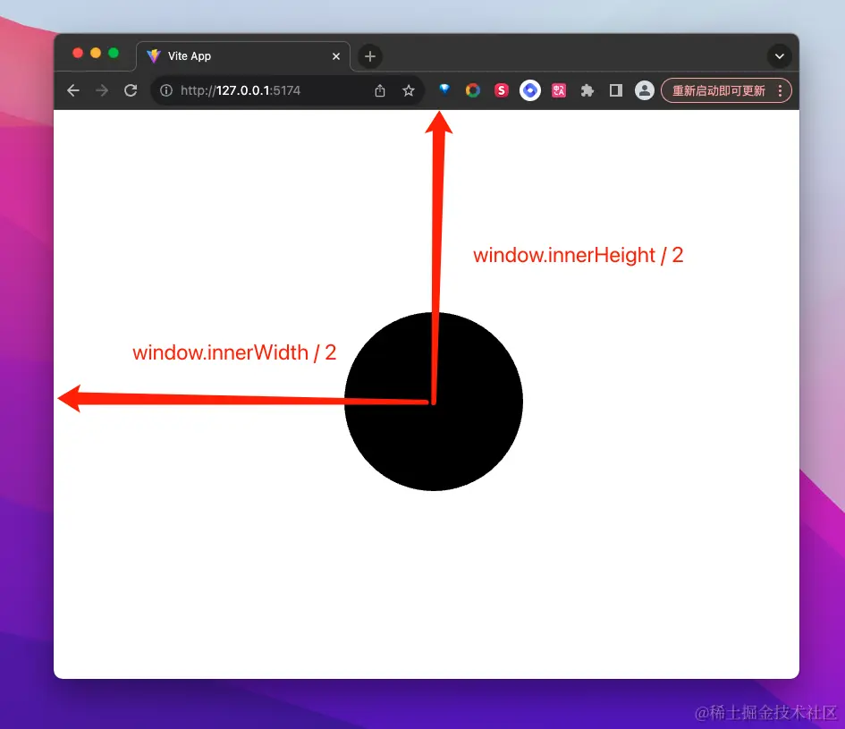 考虑到页面性能,检测圆心的屏幕坐标系坐标、渲染圆相关操作可以放到requestAnimationFrame