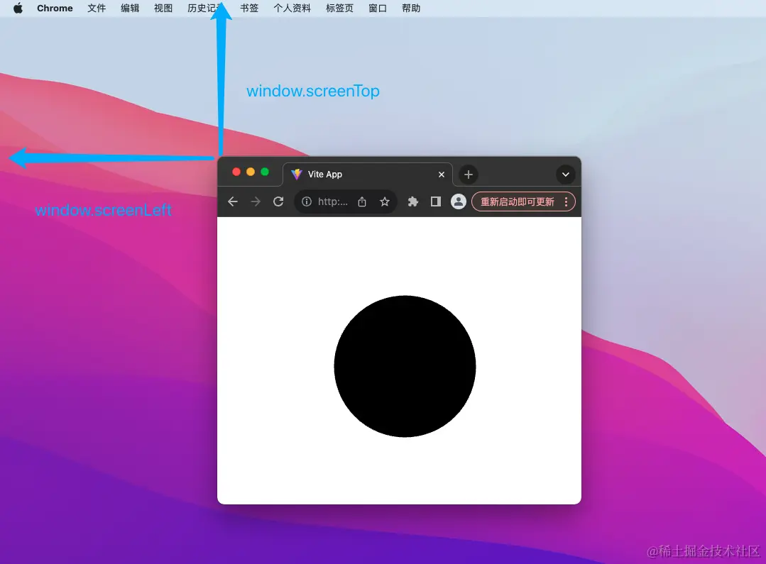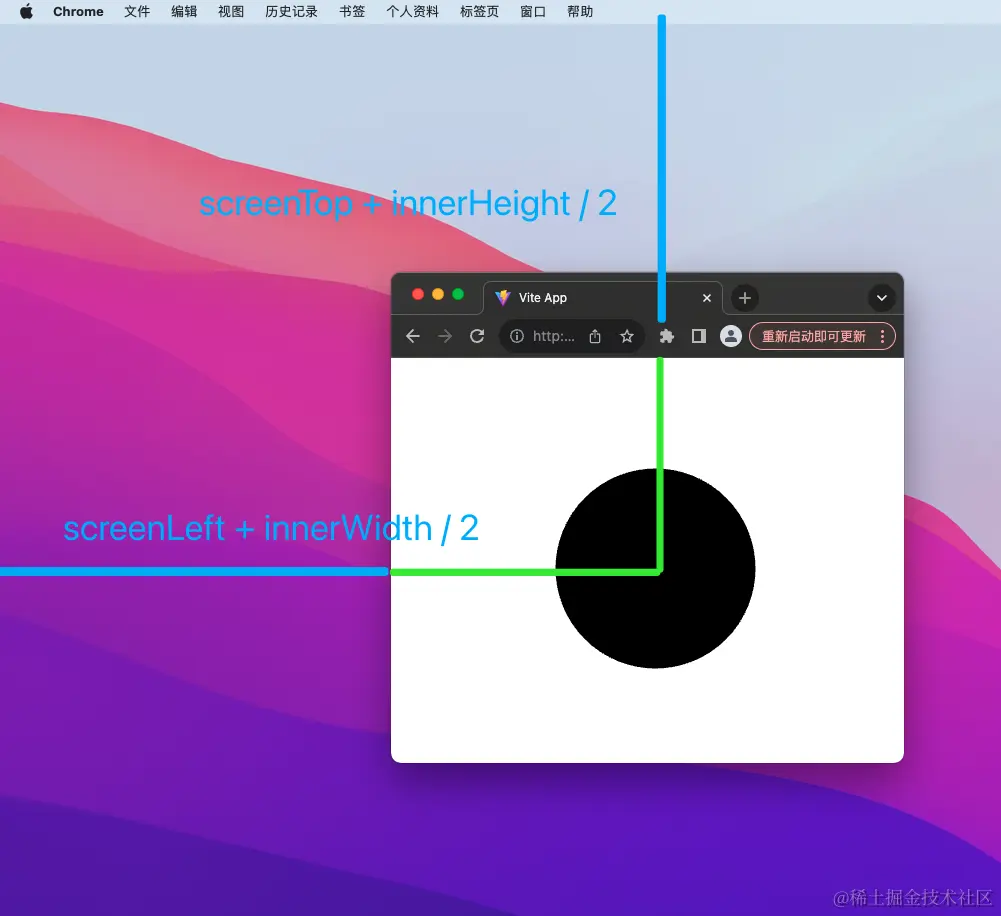 当前,我们已经知道圆心在屏幕坐标系中的坐标。如果打开多个页面,就会获得多个圆心的屏幕坐标系坐标。